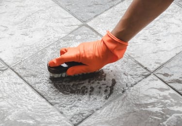 Machine scrubbing the floor and wall tiles and taps to remove dirt in the grouting and hard stains..