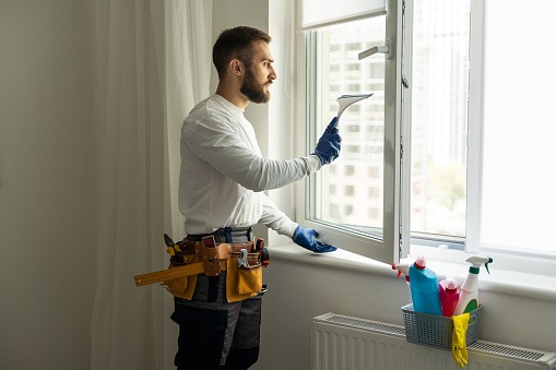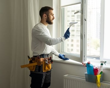 Deep cleaning spraying chemical to dirt, rust stains form window grills to wet wiping of microfiber cloth